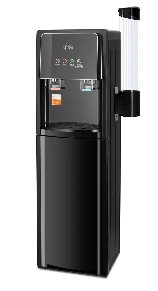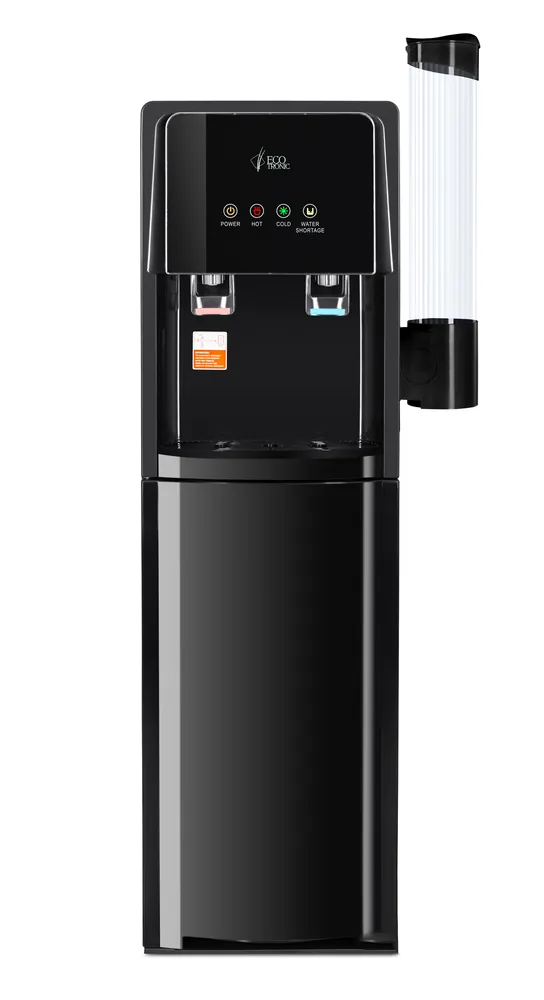 Напольный кулер с нижней загрузкой бутыли и электронным охлаждением. Краны «нажим кружкой». Корпус черного цвета с черной стеклянной вставкой на передней панели с индикаторами. Верхняя крышка с защитой от царапин. Индикация режимов нагрева и охлаждения воды, работы аппарата, индикатор пустой бутыли.